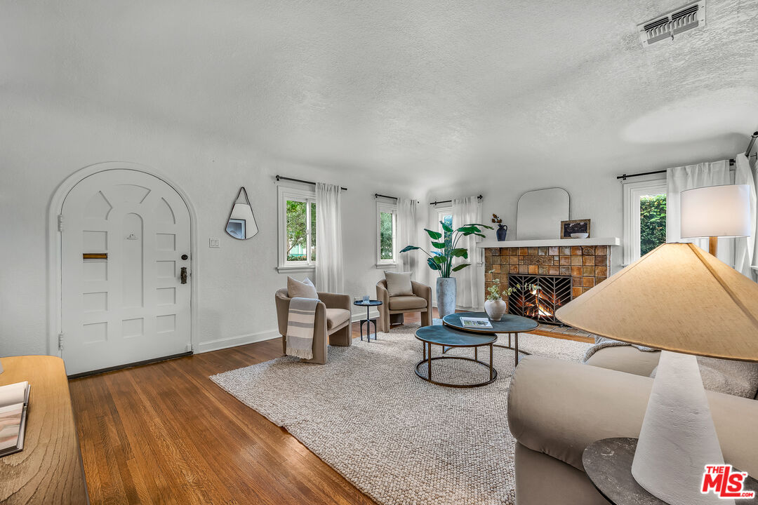 Ideally located in the heart of Larchmont Village, this charming home will captivate you from the moment you arrive. An electric gate opens to a secure driveway, offering both convenience and peace of mind. The inviting front patio provides the perfect spot to enjoy your morning coffee or unwind in the evening. Inside, a wealth of original architectural details awaits beautiful coved ceilings, arched doorways, and elegant French windows. The sunny, spacious living room features gleaming hardwood floors and a stunning Batchelder fireplace as its centerpiece. The formal dining room easily accommodates large gatherings, while the kitchen offers new countertops, ample storage, and an adjacent laundry room for added functionality. The large bathroom includes a tub and a comfortable vanity area, ideal for starting your day in style. The bright and airy primary bedroom offers a tranquil retreat, and the second bedroom opens directly to the private backyard an oasis with multiple areas for dining, relaxing or play. The converted garage serves as a versatile office or creative studio, complete with custom built-ins and French doors. Additional features include central air conditioning and a security system. Just blocks from Larchmont Boulevard's beloved shops, cafes, and boutiques, this very special home perfectly blends original character with modern comfort in one of Los Angeles's most desirable neighborhoods.