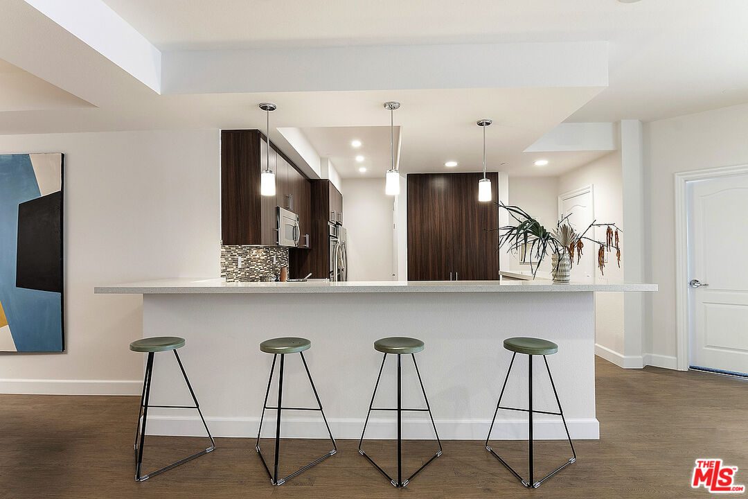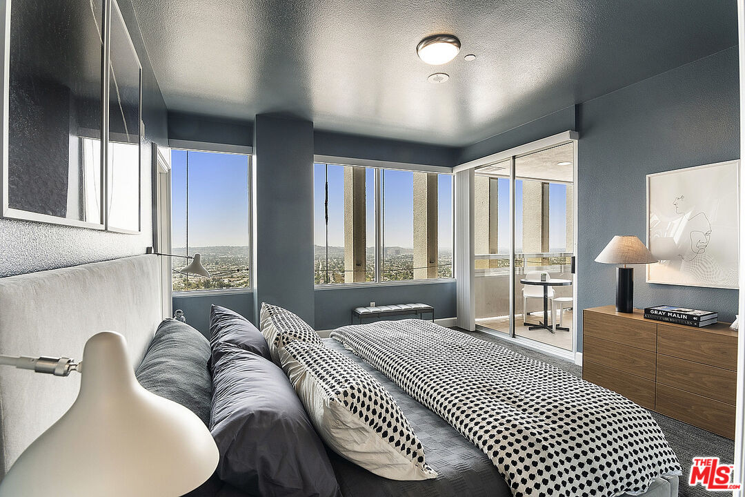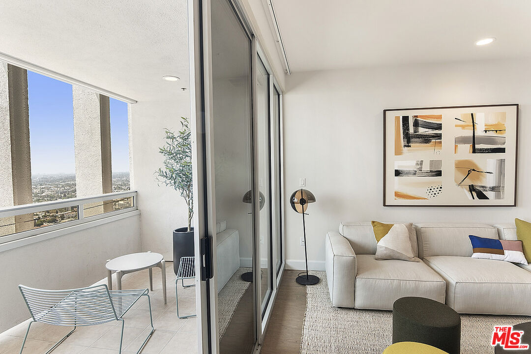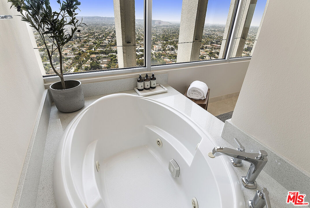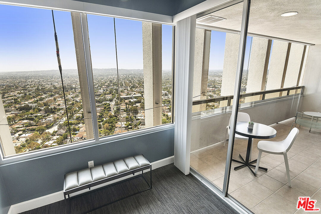 Private Penthouse suite located on the top level of a sky rise office building with panoramic views 1 bedroom and 1.5 baths. Abundant natural light with floor to ceiling windows throughout the space. Renovated kitchen with new appliances and breakfast bar. Updated bathroom with separate shower and tub with dual vanity sinks. Private balcony. Walk in closets. Central AC. Laundry in unit. Newly equipped gym, lounge area, screening room, and conference room all located on site. Two garage spaces with electric vehicle charging stations available. Located in the heart of the Los Angeles with close proximity to museums, shopping, dining, and downtown LA. Move in special of one month free.
